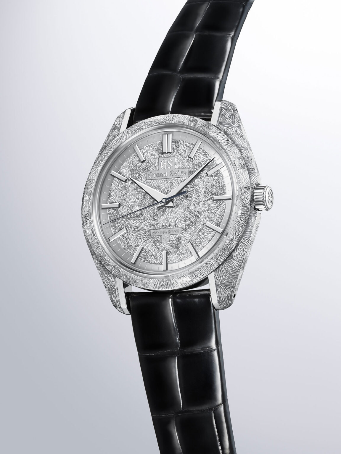 At Watches & Wonders 2026, Grand Seiko introduces a new limited edition that pays tribute to its iconic 44GS – the watch that inspired the Grand Seiko Style – while placing the exquisite artistry of hand engraving on full display. Both the dial and Platinum 950 case feature hand engraving inspired by flowing water. The dial expresses spring water as it emerges from the earth with engraved lines that run in multiple directions and converge in a seamless flow. Echoing the engraving on the dial, the case is covered in countless hand-engraved lines inspired by the mystic Tateshina Waterfall. The radiating patterns seamlessly traverse the sharp angles of the 44GS case in a breathtaking expression of creativity and craftsmanship. Thanks to the manually wound movement within, the 40mm diameter watch adopts a slim profile. At just 9.6mm thick, this watch has the same height as the original 44GS from 1967.